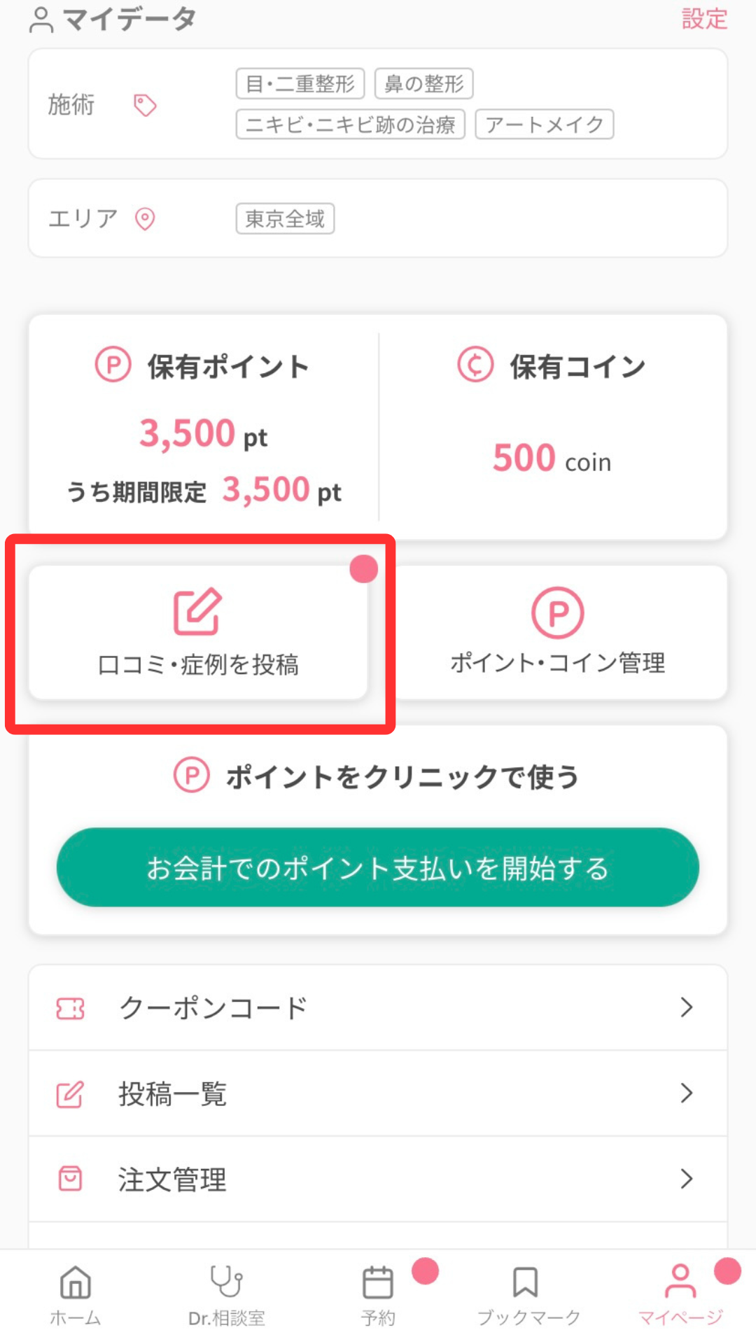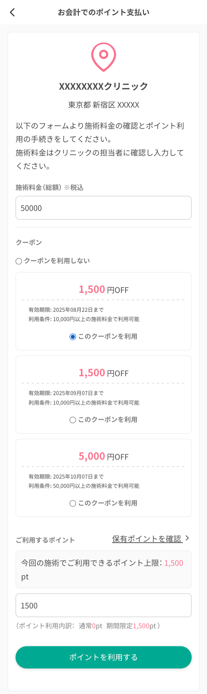 ※「ポイント支払い可」の表示があるクリニックでのみクーポン利用が可能です。予約時に確認しましょう。
