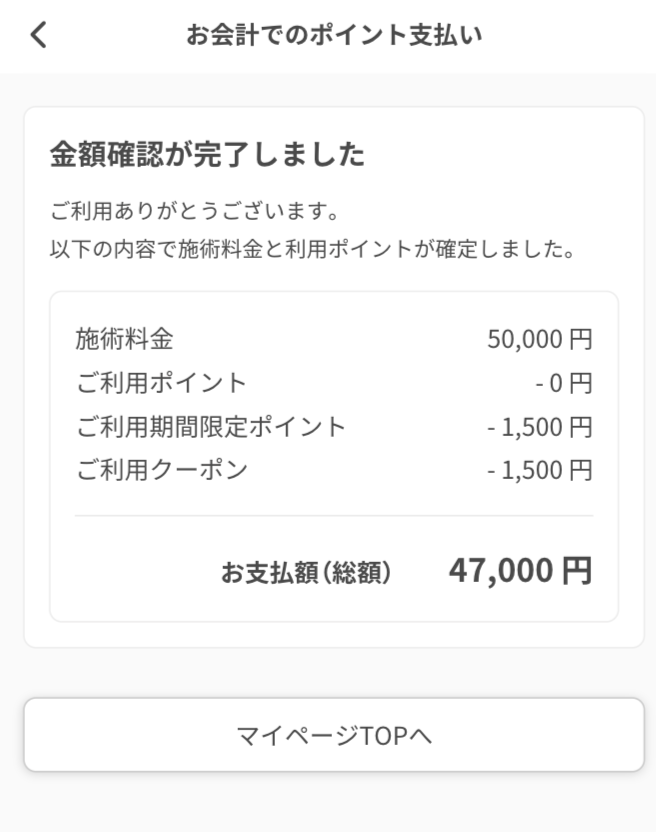 選択したクーポン・ポイント分を割り引いた金額でお会計を行い、終了です。