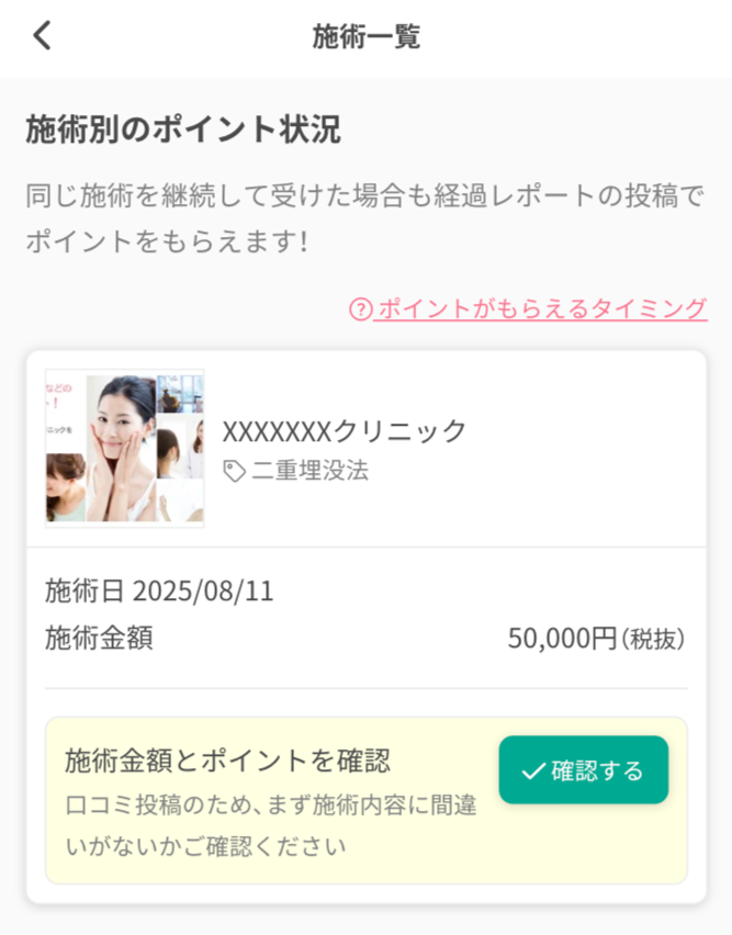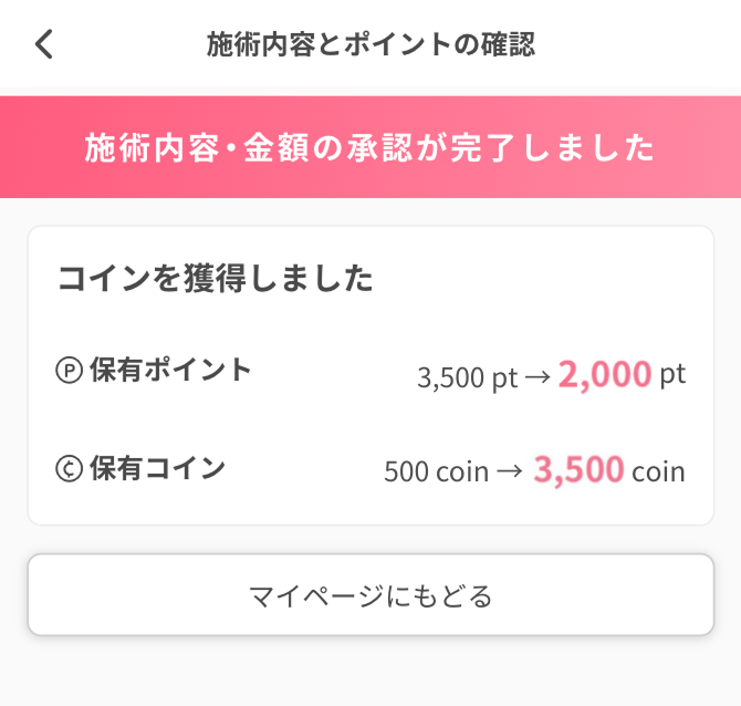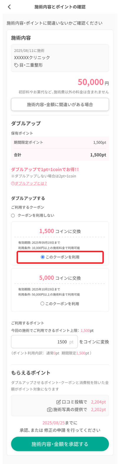 ※実績承認とは、施術内容の確認のことです。店頭でのポイント利用対象外クリニックの場合、実績承認時にダブルアップ機能の活用でクーポンを使用し、クーポン額分を現金化することが可能です。