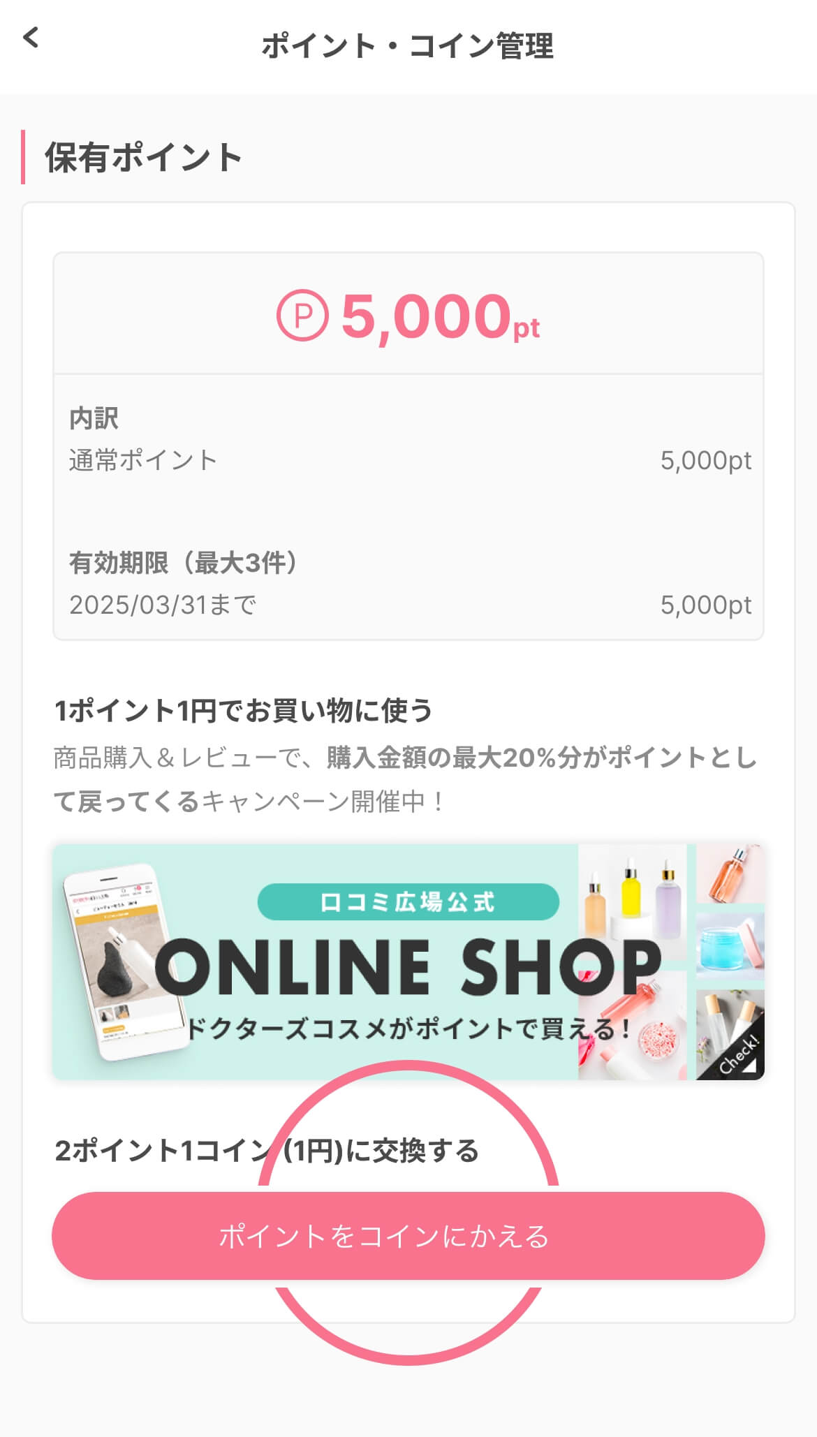新たにクリニックで施術を受ける予定がない方は、2pt=1coin(1円)としてポイントをコインに交換する手続きが行えます。 コインは外部サイトを通じて現金や電子マネーに変換することができます。