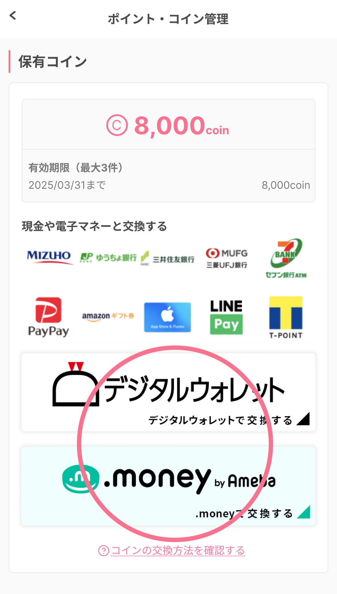 ※提携サイトは、『デジタルウォレット』『.money』です。コインを交換する際は、各サービス事業者の定める手数料が発生する場合があります。詳しくは各社のサービスサイトをご確認ください。