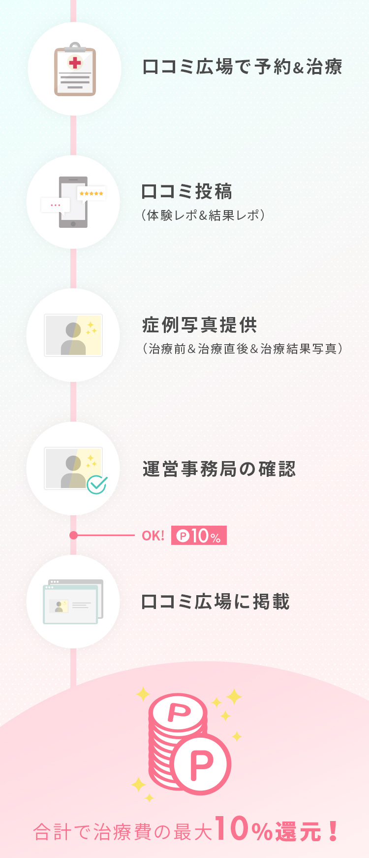 施術を受けた後、指定の期日までに口コミと症例を投稿すると施術費用の10%分のポイントが還元されます。