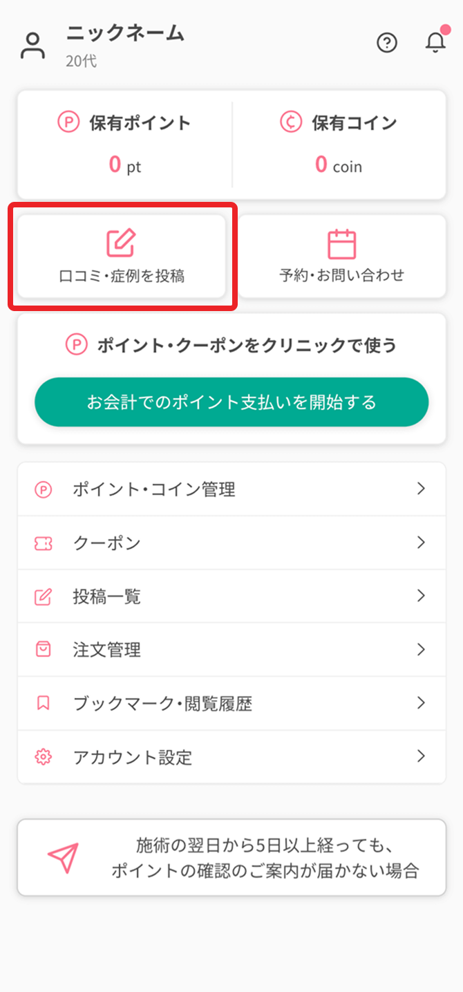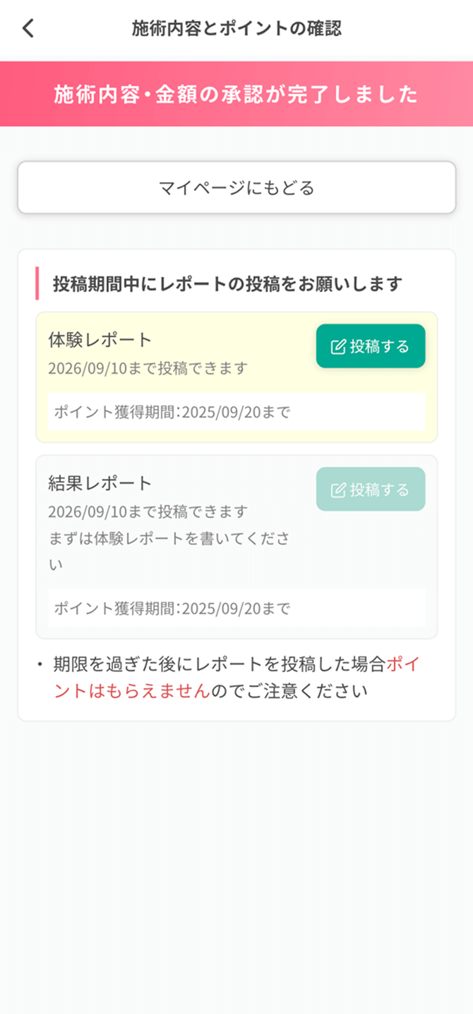 口コミを書くには施術を受けたことを証明する施術証明書を提出し、レポートを投稿することで施術金額の最大5%がポイントとして獲得できます。