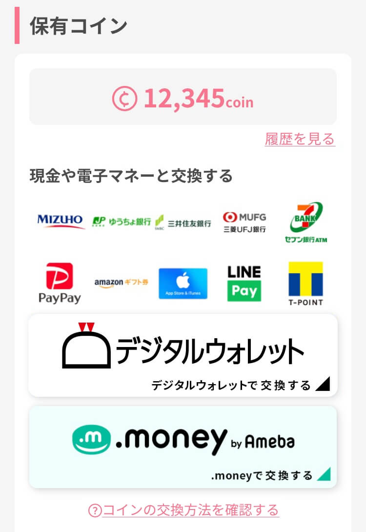 コイン交換サイト(外部サービス)を利用することで、口コミ広場で獲得したコインを現金・電子マネーなどへ交換することができます。